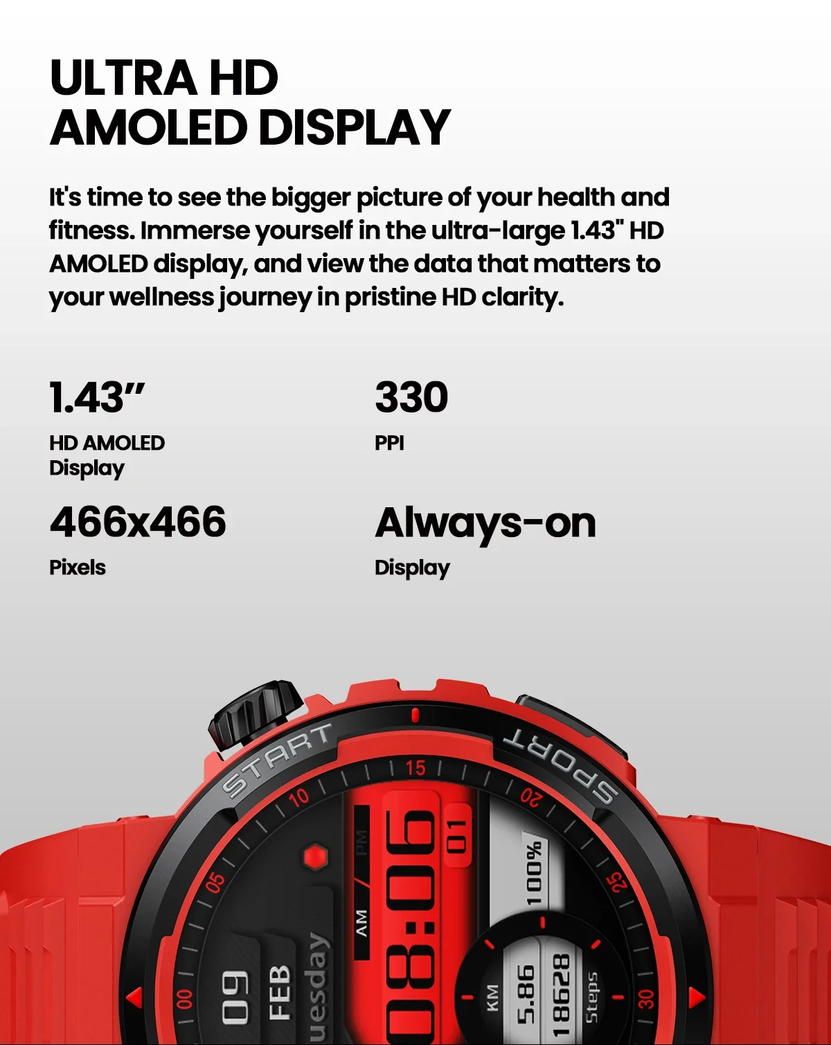 【1.43" HD AMOLED Display】At ultra-large 1.43" HD AMOLED the Zeblaze Ares 3 Plus display is enhanced in size, vibrancy, and resolution. Curved to look natural on your wrist, the screen is made from tempered glass covered with an anti-fingerprint coating. Enjoy a bigger screen and a smarter style.